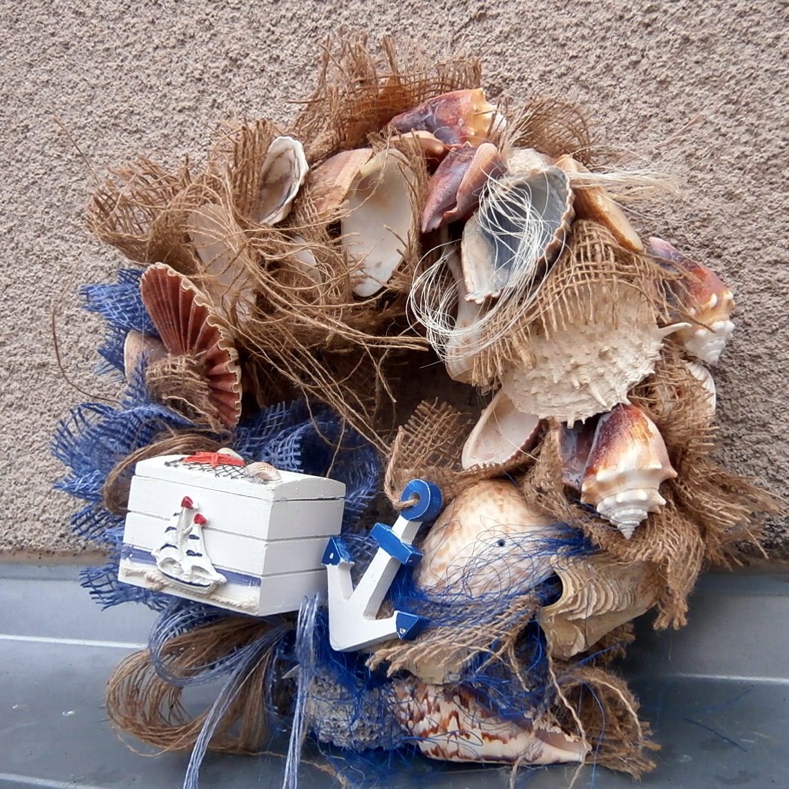 Trvanlivá dekorace z velkých, krásných mušlí, lastur, s dřevěnou truhličkou, kotvou...Průměr 32cm.