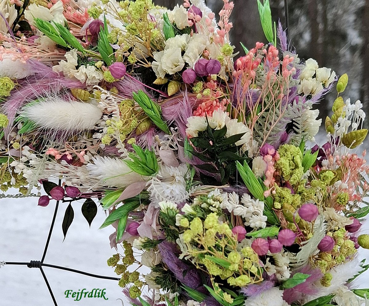 Krásný bohatě zdobený přírodní věnec ze sušených a stabilizovaných rostlin, s dřevěnými a exotickými květy na základu z proutí.