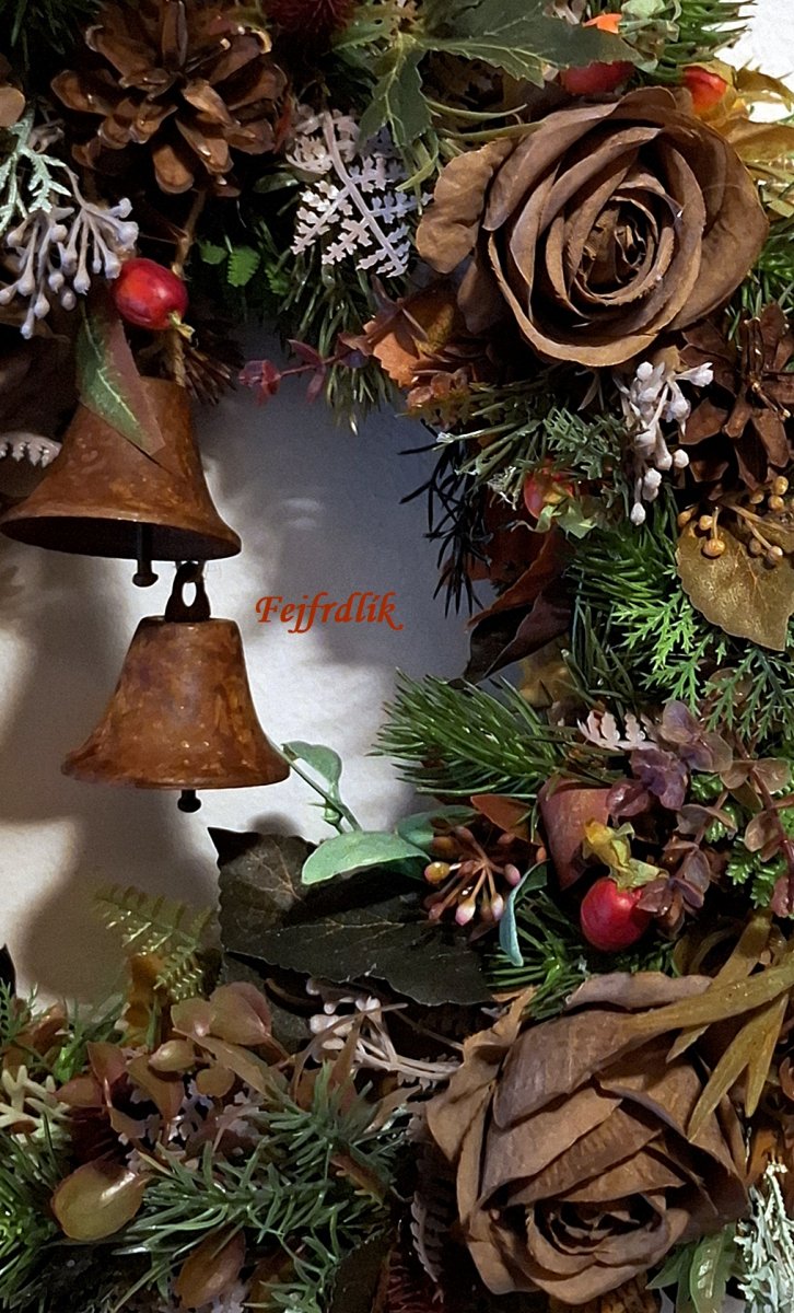 Bohatě vázaný trvanlivý věnec z různého umělého jehličí, kapradí, na slaměném korpusu obaleném jutovinou , s látkovými růžemi , šiškami a šípky na Vaše dveře :). Zavěšeny plechové rustikální zvonky.