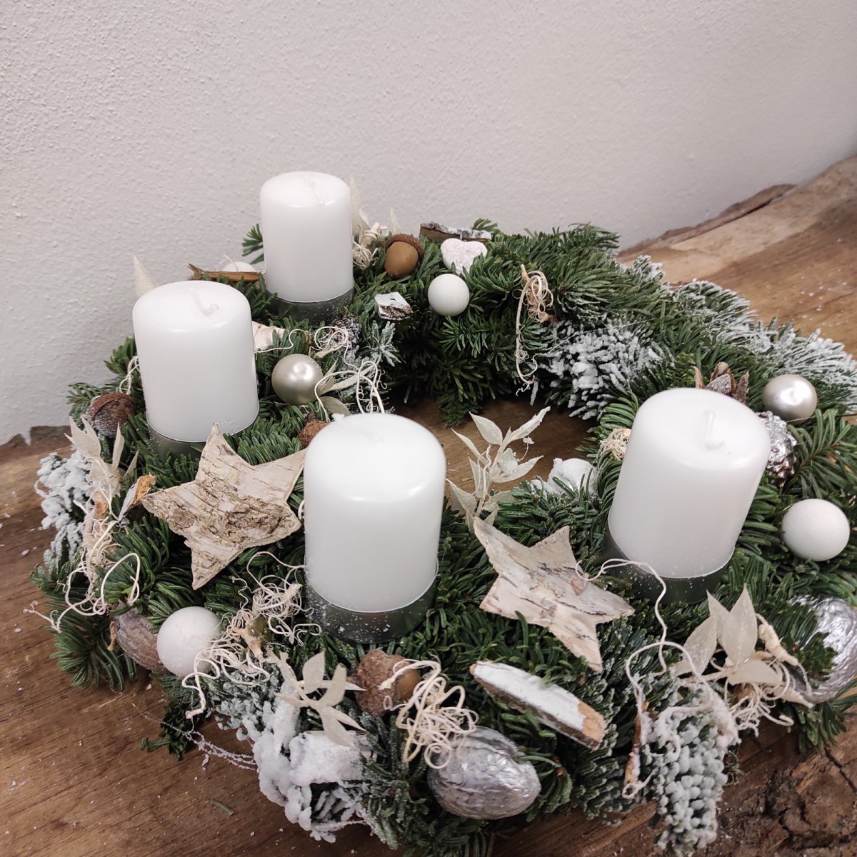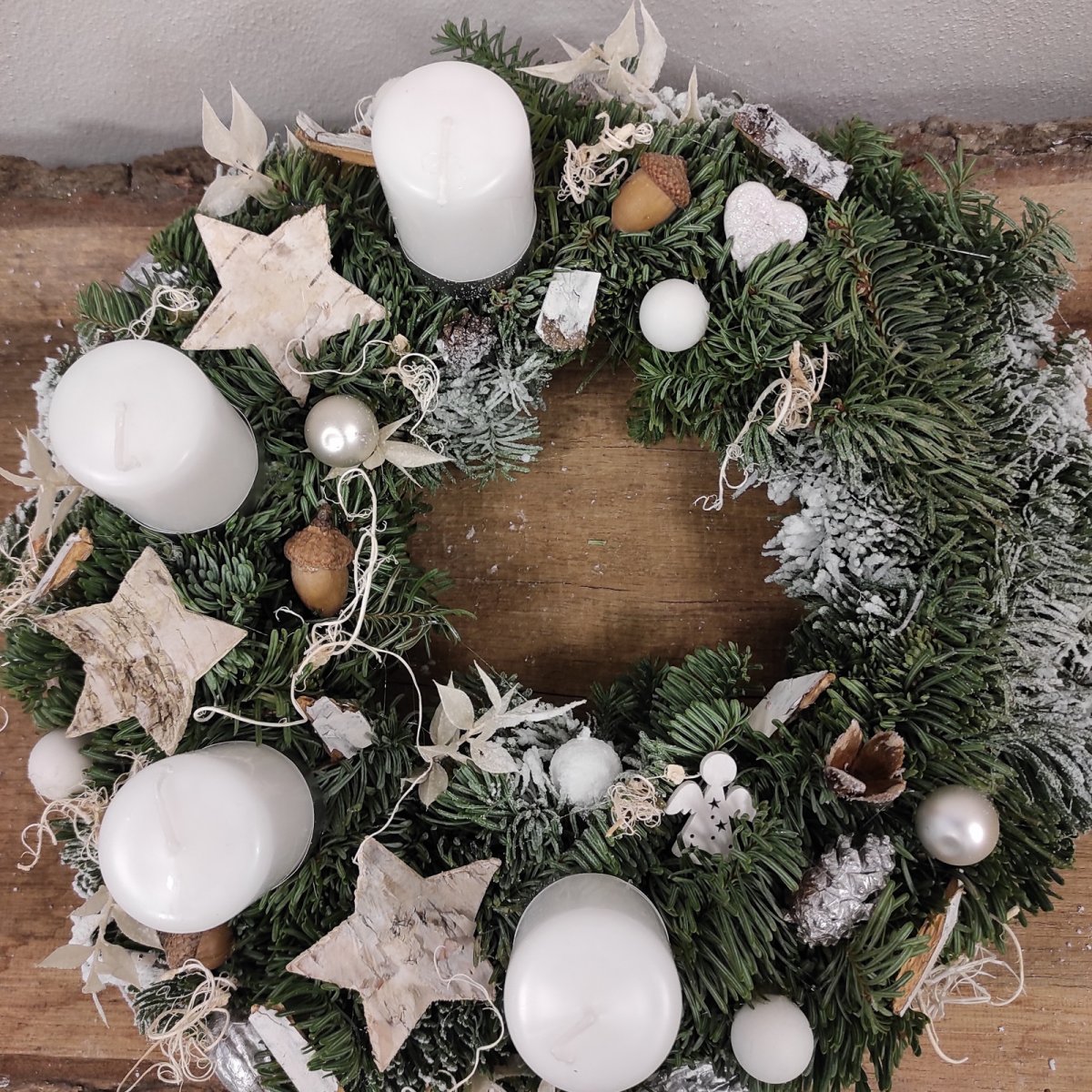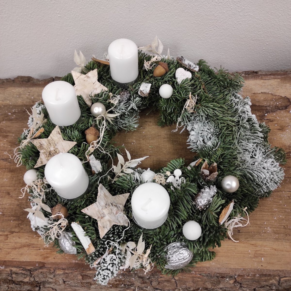 Přírodní adventní věnec vytvořený vázáním čerstvé chvojí Abiens Nobilis - profesionální neopadavá aranžérská chvojí, chvojí na větvičkách uschne, ale neopadá, nesprchne, věnec dozdobený přírodními doplňky, skleněné a plastové vánoční koule a doplňky, aranžérský sníh, 4x svíčka na hliníkových podstavcích v ceně věnce.