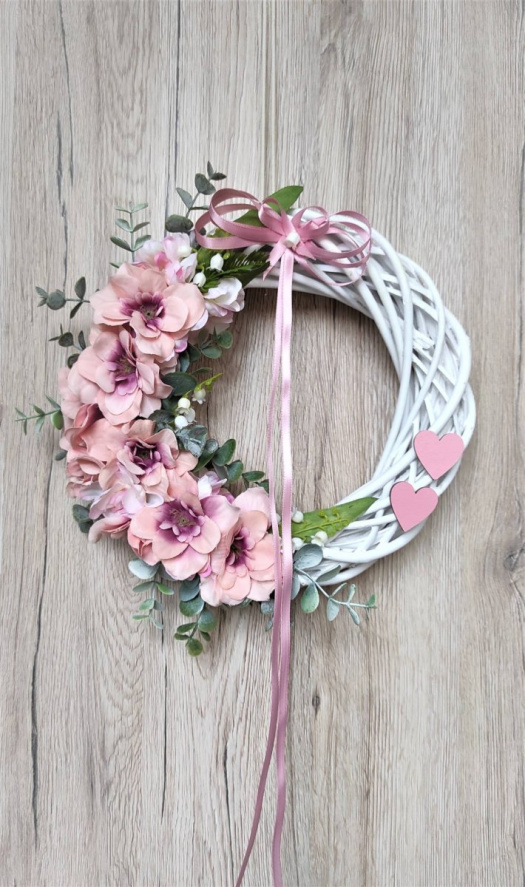 Krásný romantický proutěný bílý věnec do růžovovínového ladění k zavěšení na stěnu nebo na dveře, menší velikosti, průměr cca 26 cm. Je ozdoben látkovými květy, větviček eukalyptu, srdíčky a dalšími přízdobami.