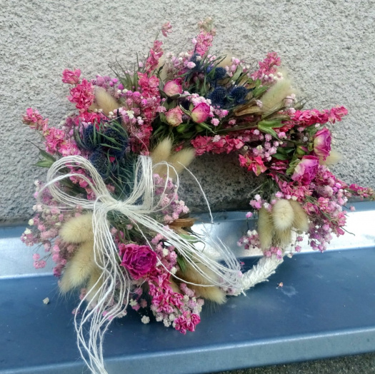 Na tenkém kroužku, omotaném bělenou jutou je naaranžována gypsophyla, růžová ostrožka, černucha orientální, bodláčky, růže, lagurus... Průměr 29cm.