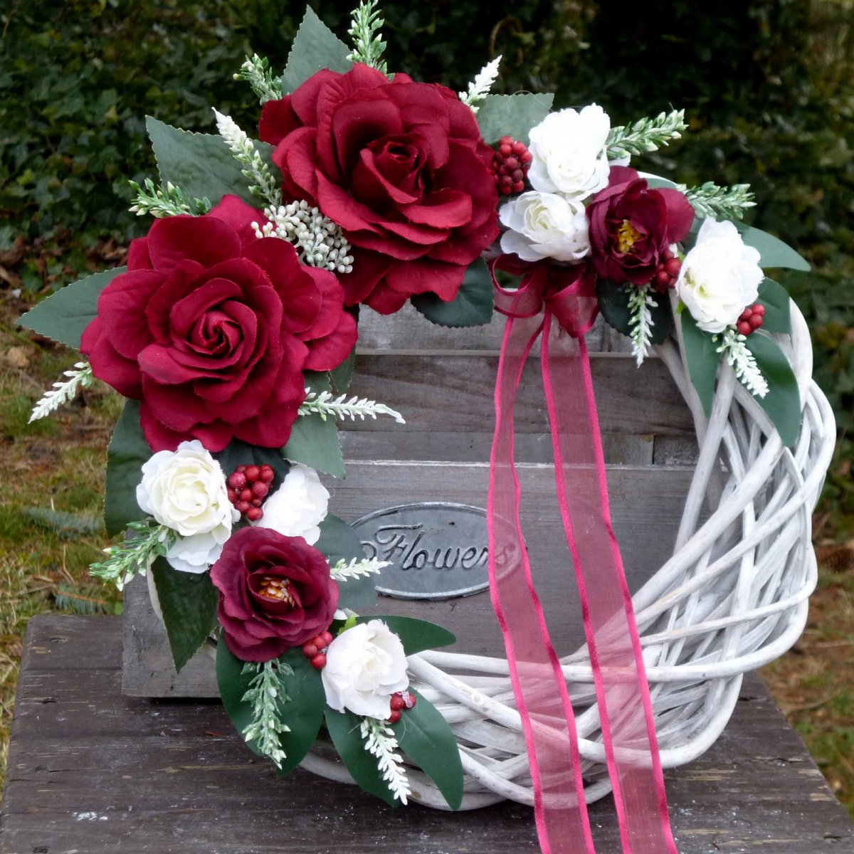 Věnec z šedobílého proutí s velkými vínovými růžemi, doplněnými malými bílými růžičkami, vínovými bobulkami a organzovou stuhou ve stejném odstínu.