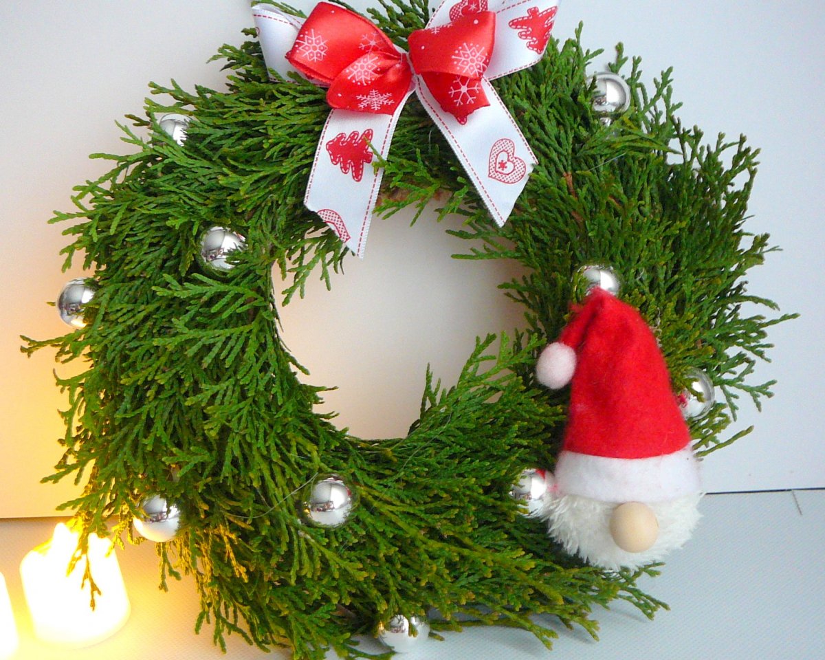 Věnec plný kouzel – tradiční zelená, stříbrné ozdoby a roztomilý Santa. Vánoce začínají u vašich dveří. Průměr 23 cm.