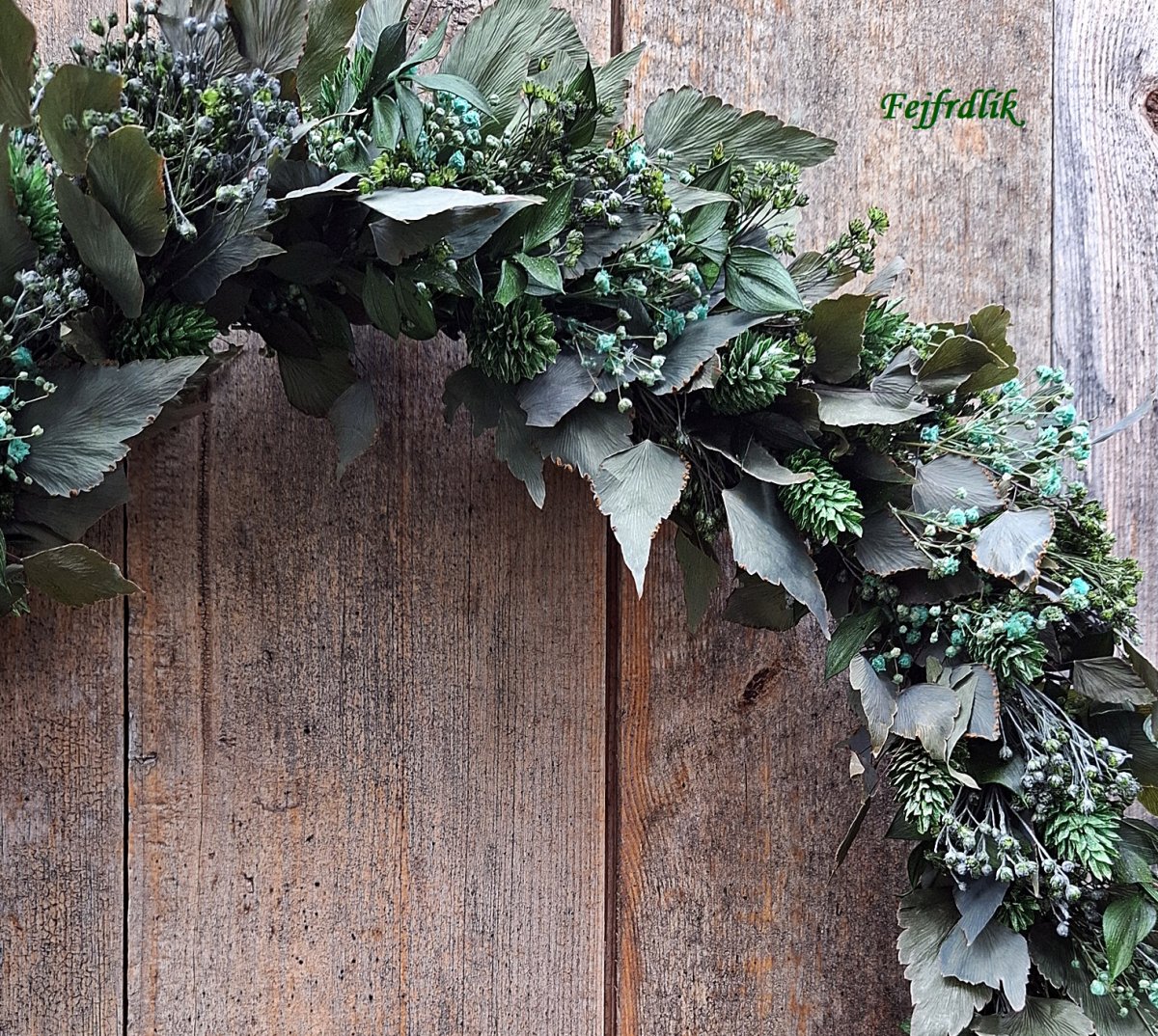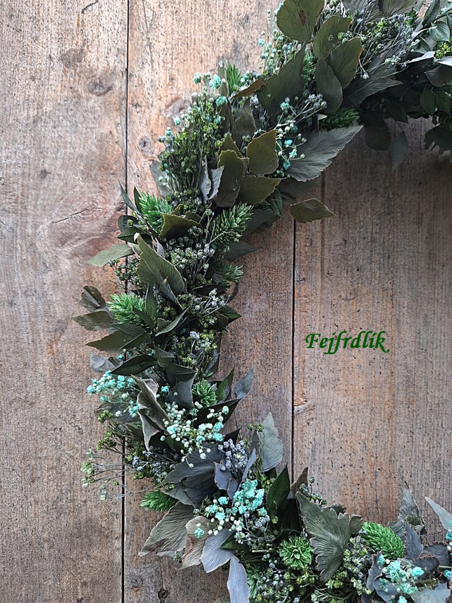 Originální vázaný věnec se sušinou mix (stabilizovanou a sušenou) v zelených barvách na kovovém kruhu s očkem na zavěšení.