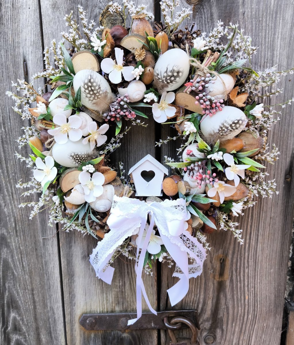 Velikonoční věneček, průměr cca 30 cm, vzadu háček na zavěšení.
