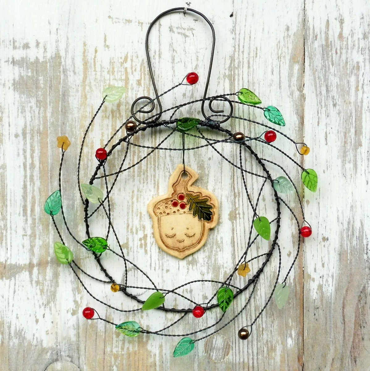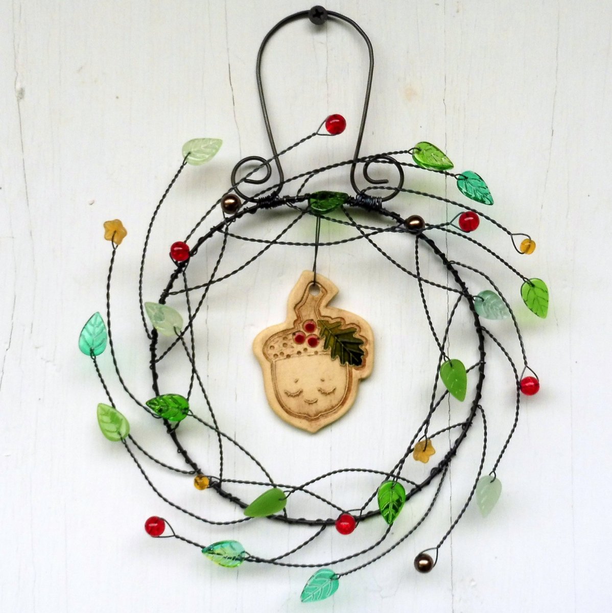 Menší drátovaný věneček, obrázek... drátky, skleněné lístečky a korálky, keramický žalud.