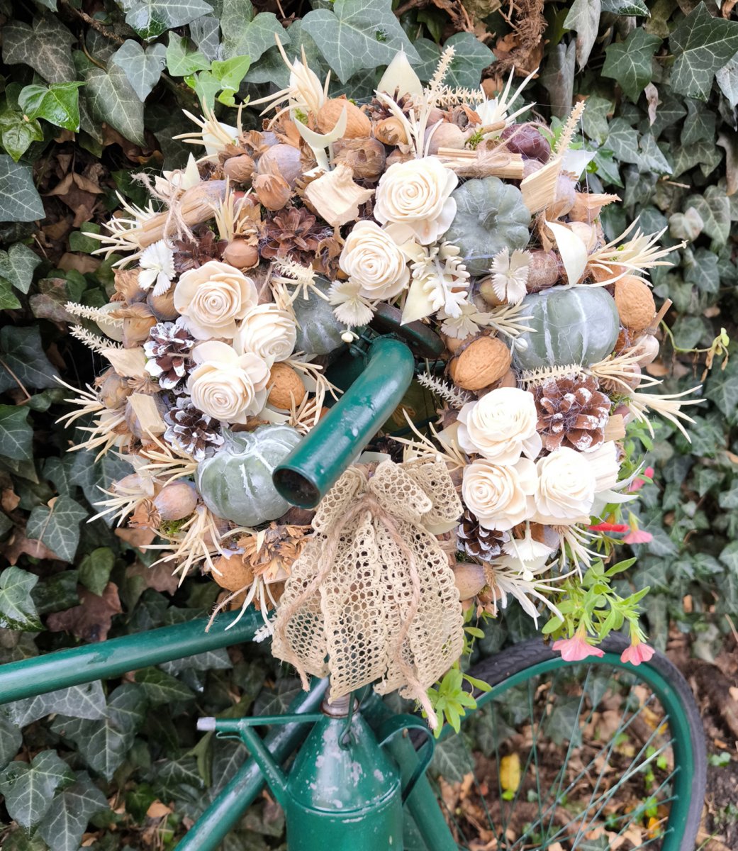 Podzimní věneček, průměr cca 30 cm, vzadu háček na zavěšení.