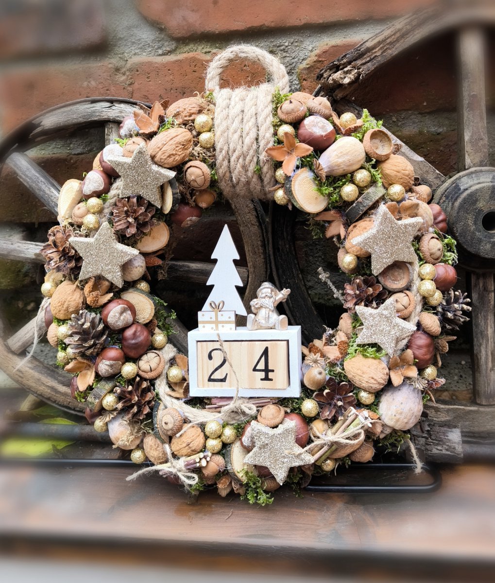 Trvanlivý věneček s adventním kalendářem - dřevěná dekorace - dvě otáčecí kostičky, průměr věnečku cca 30 cm,