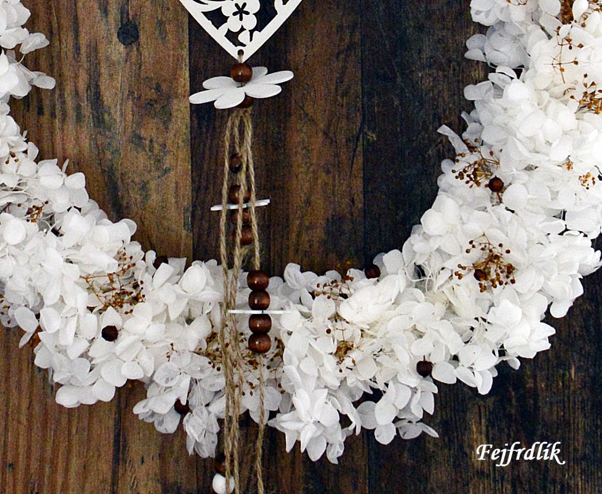 Věneček na kovovém kruhu s očkem na zavěšení se sušenou , stabilizovanou bělenou hortenzií , lnem a s kovovou ozdobou s dřevěnými korálky.