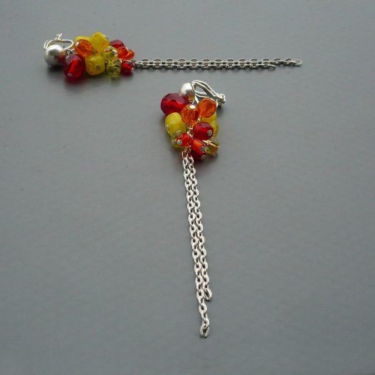 Náušnice jsou tvořeny z uspořádaných žlutých, oranžových a červených skleněných korálků a ocásku z drobného řetízku stříbrné barvy.