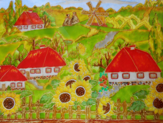 Vesnička se slunečnicami malovaná na skle speciálními konturami a vitrážovými barvami na sklo. V klips skle, upravená na pověšení na zeď.