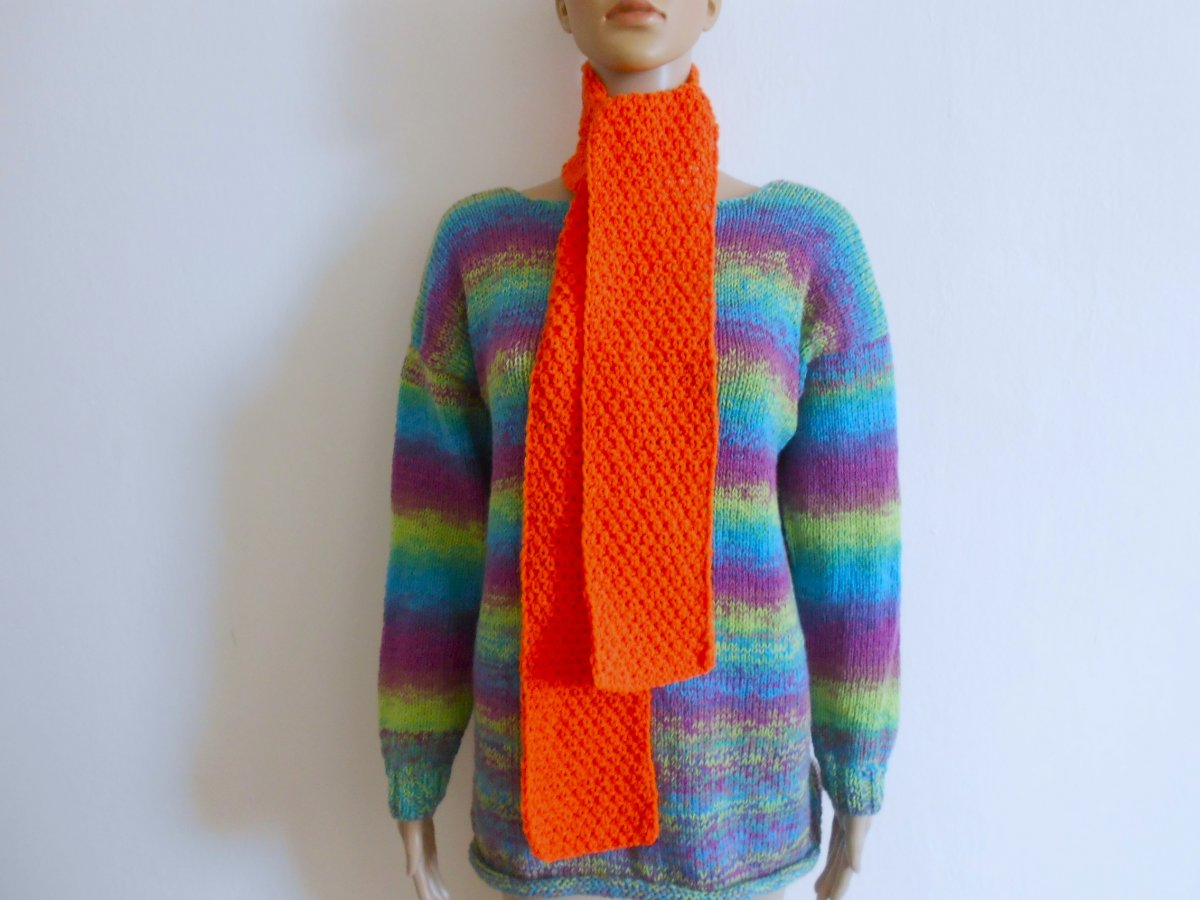 Ručně pletená, pružná, střední šála oranžová. Velikost: délka 154cm, šířka 11cm. Doporučuji ruční praní nebo v pračce program na vlnu, sušit volně položené.