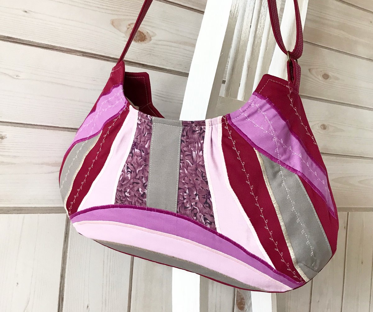 kabelka je ozdobně členěná a ozdobená strojovou výšivkou