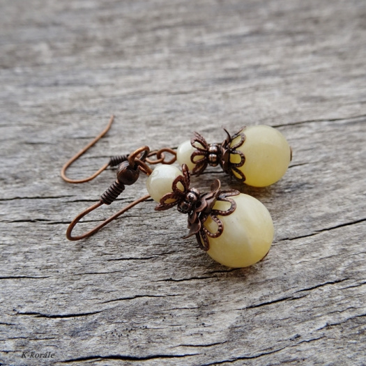 Náušnice jsou vyrobeny z přírodního aragonitu, mléčně béžového skleněného korálku, různých druhů kaplíků, akrylových korálků.