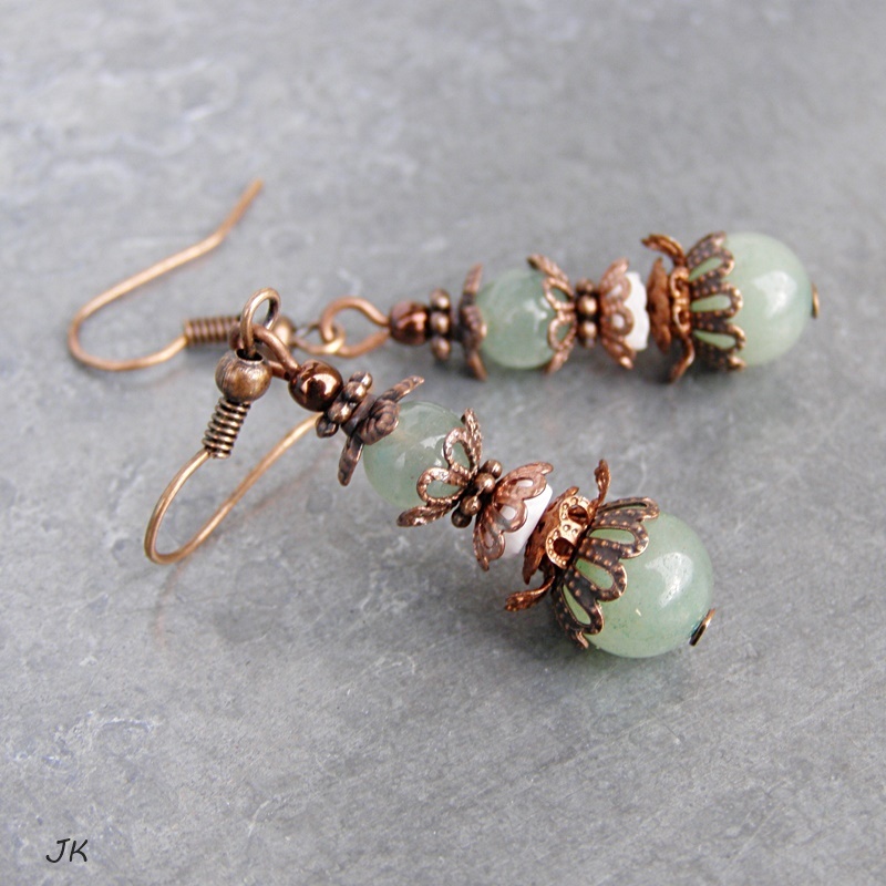 Náušnice jsou vyrobeny z korálků přírodního zeleného aventurinu, které jsou doplněny o různé druhy kaplíků, korálky bílého korálu a malé skleněné korálky měděné barvy.