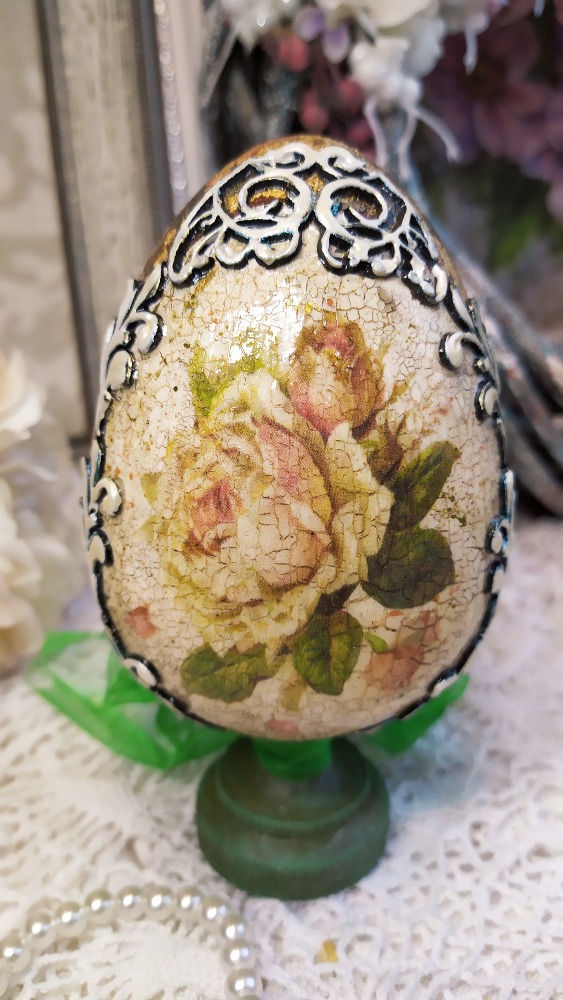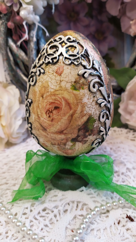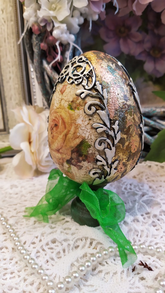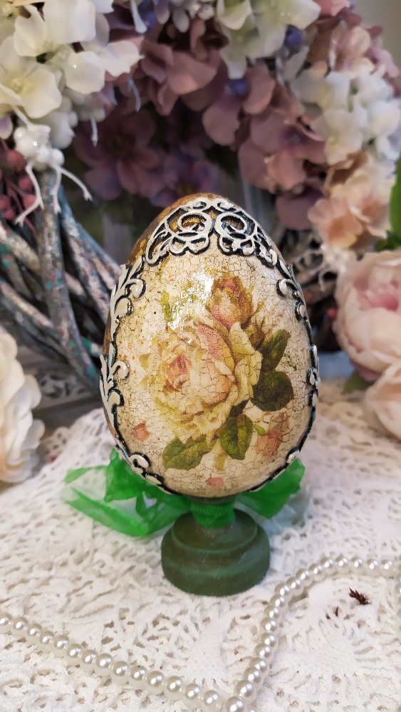 Dekorace vajíčko na dřevěném stojánku s motivem krásných vintage růží. Bok vajíčka je zlacený zlatavými plátky tří barev. Okolí růžiček je reliéfně dekorované bordurou zdobenou perleťovou barvou. Dřevěný stojánek je opatřený zářivě zelenou veselou stuhou. Hlavní motiv je krakelovaný a celé vajíčko lakované lesklým lakem.