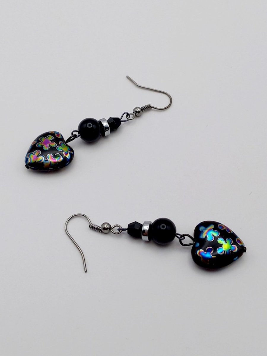 Ručně ketlované visací náušnice, ve kterých se jemnost skla potkává s hloubkou minerálů. Dominantou je skleněné srdce o velikosti 1,5 × 1,5 cm, zdobené vitrailovým vzorem drobných kytiček, které se při pohybu rozzáří proměnlivými odlesky.