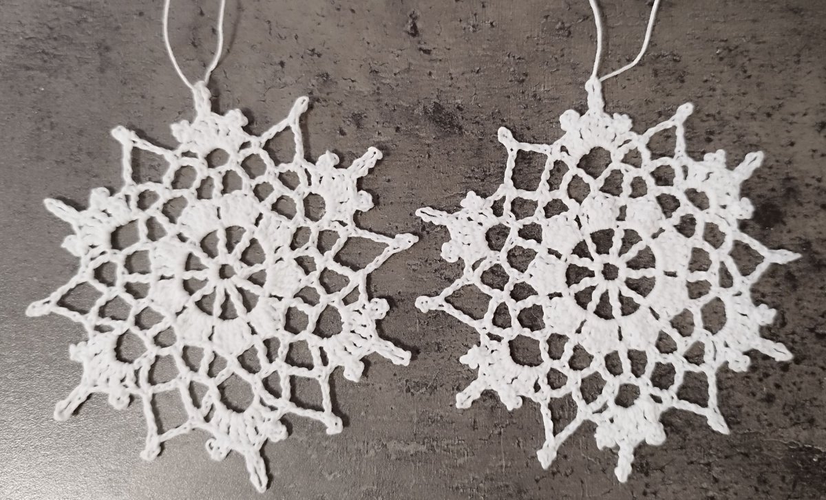Háčkovaná vločka bílé barvy, natuženo cukrem, pevný tvar, nezažloutává.