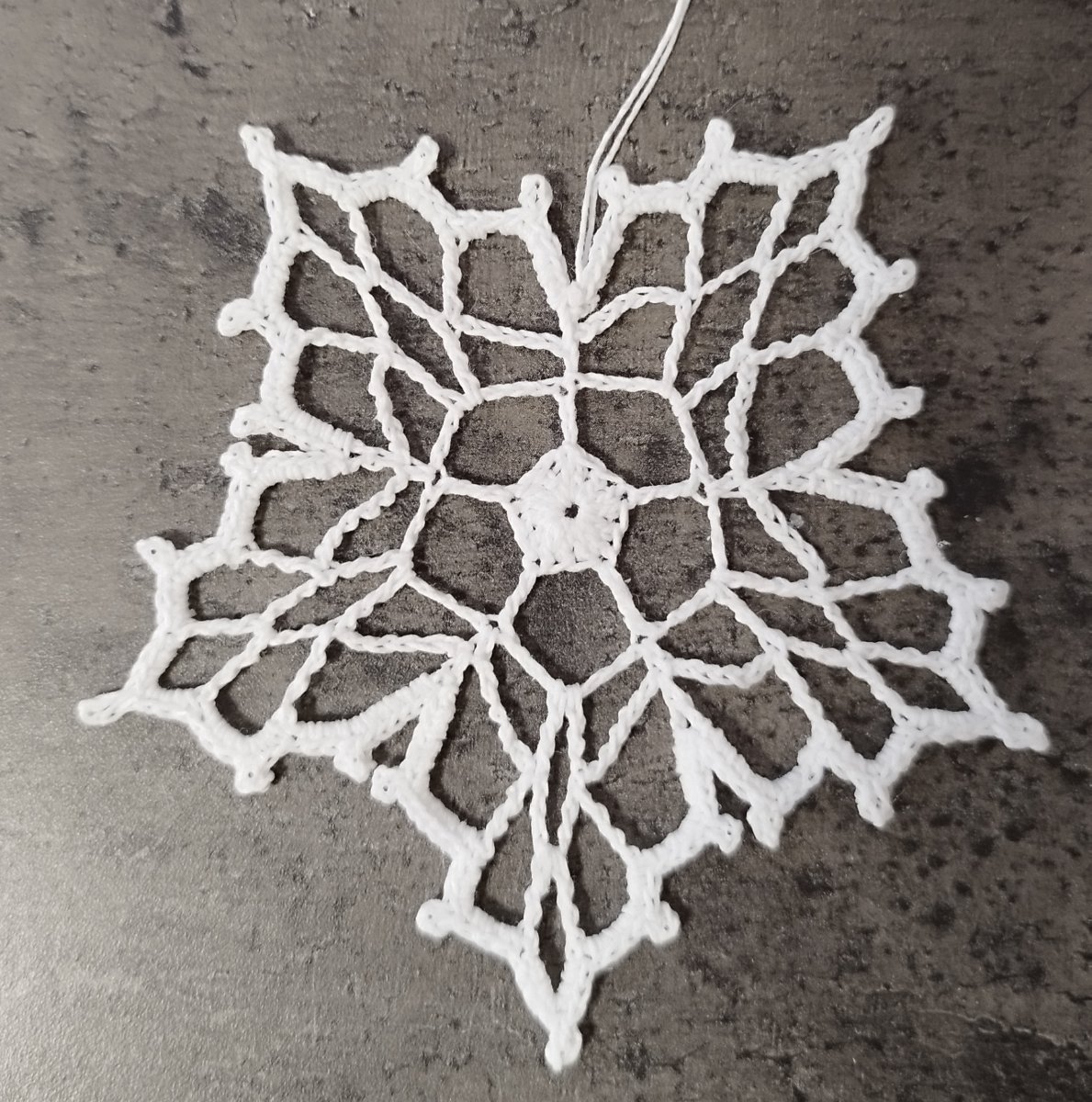 Háčkovaná vločka bílé barvy, natuženo cukrem, pevný tvar, nezažloutává.