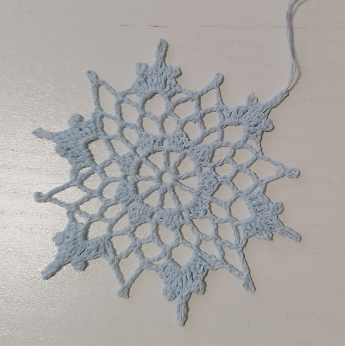 Háčkovaná vločka světlounce modré barvy, natuženo cukrem, pevný tvar, nezažloutává.