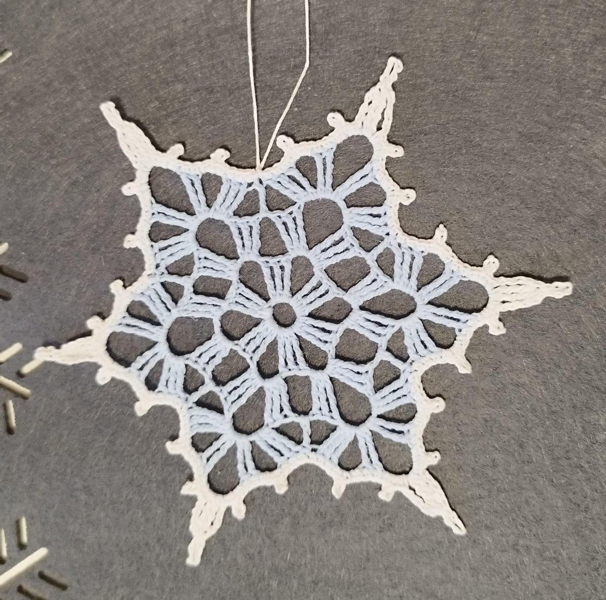 Větší háčkovaná vločka světlounce modré barvy s bílým lemem, natuženo cukrem, pevný tvar, nezažloutává.