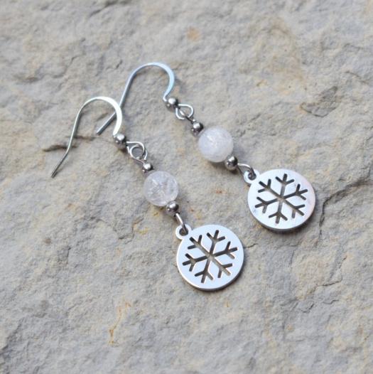 Náušnice jsou vyrobeny z kuliček praskaného křišťálu, nerezových přívěsků a komponentů z chirurgické oceli. Délka je cca 2,5 cm bez afroháčku.