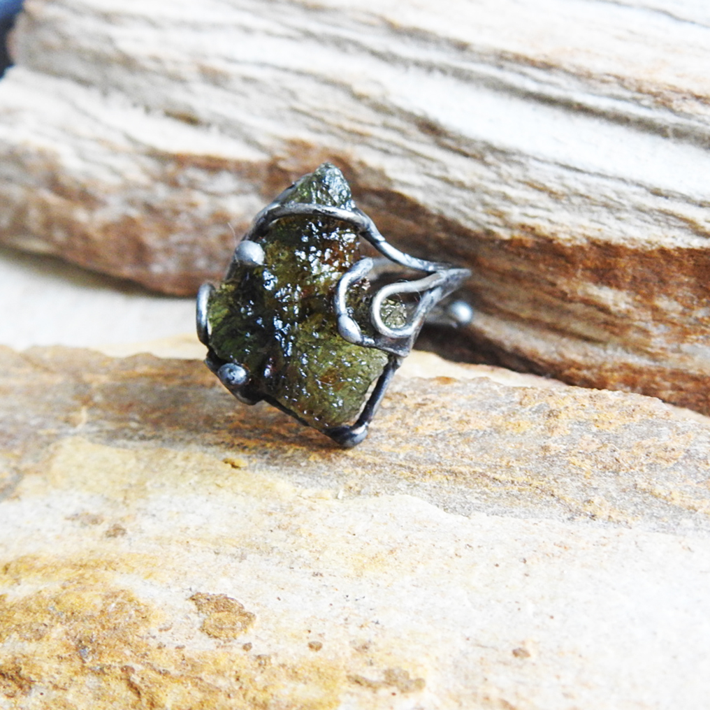 Cínovaný prsten s vltavínem.