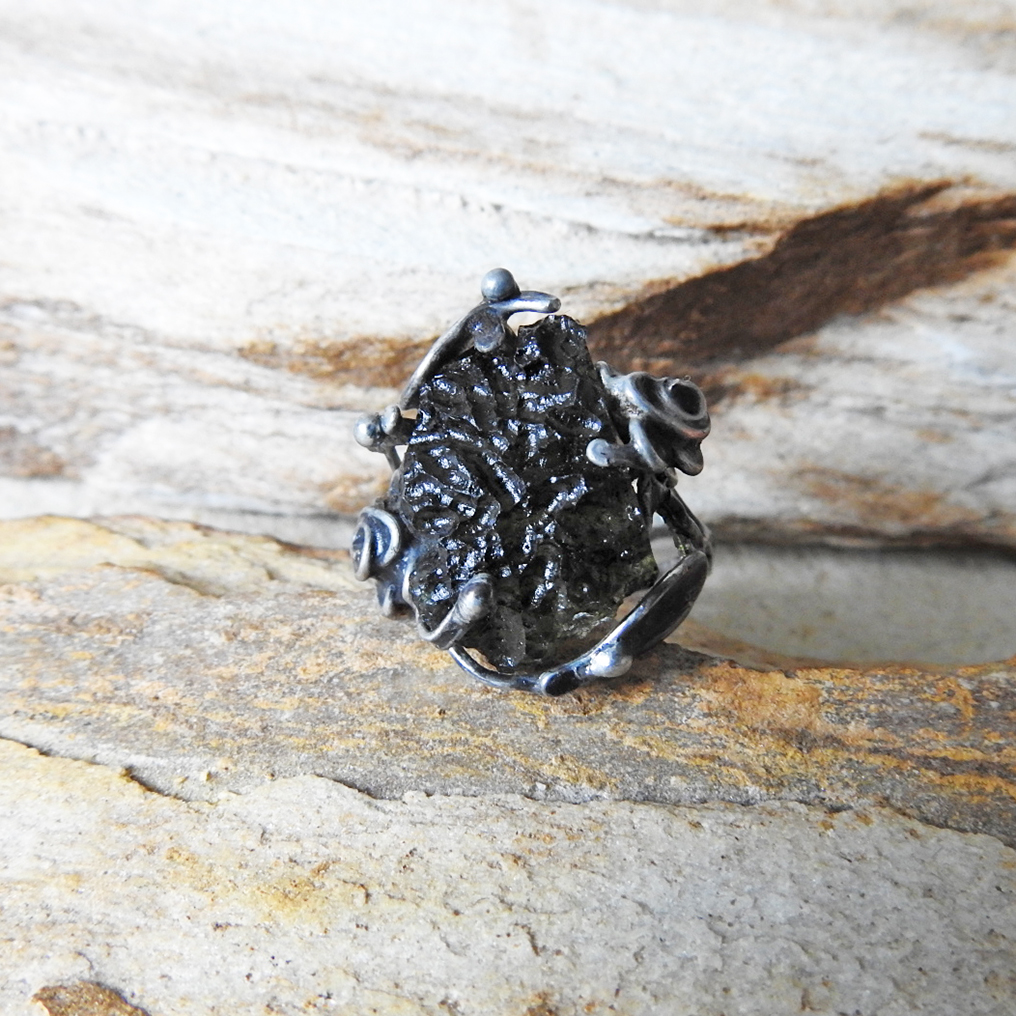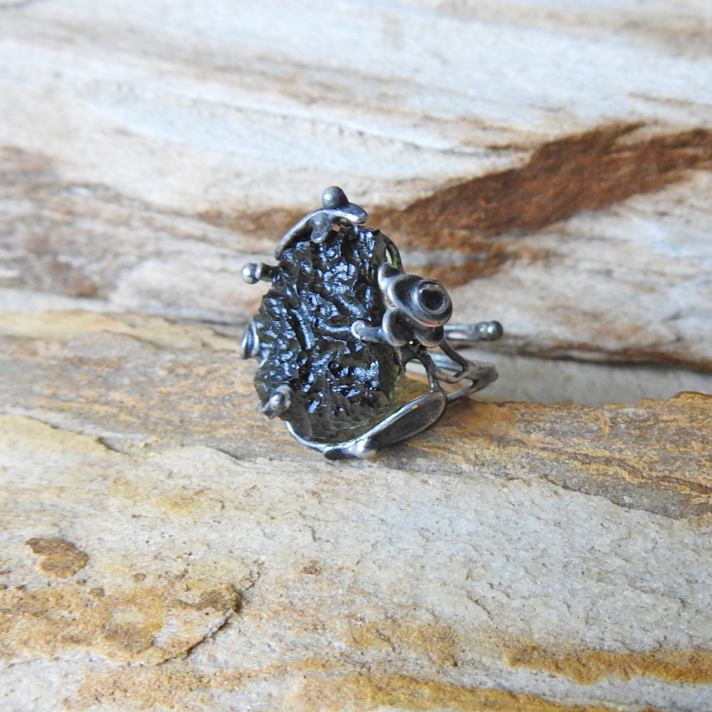 Cínovaný prsten s vltavínem.