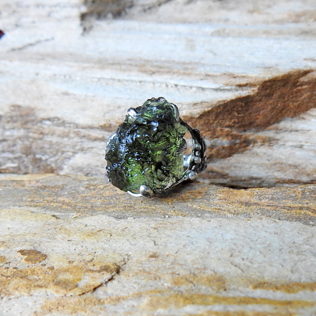 Cínovaný prsten s vltavínem.