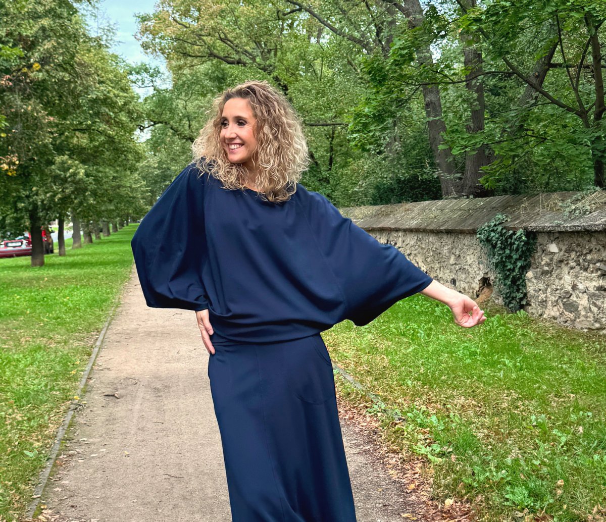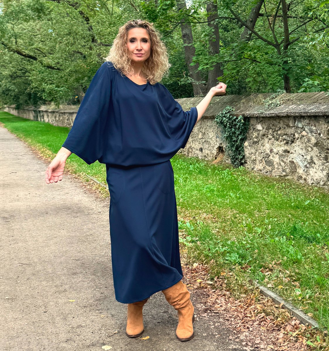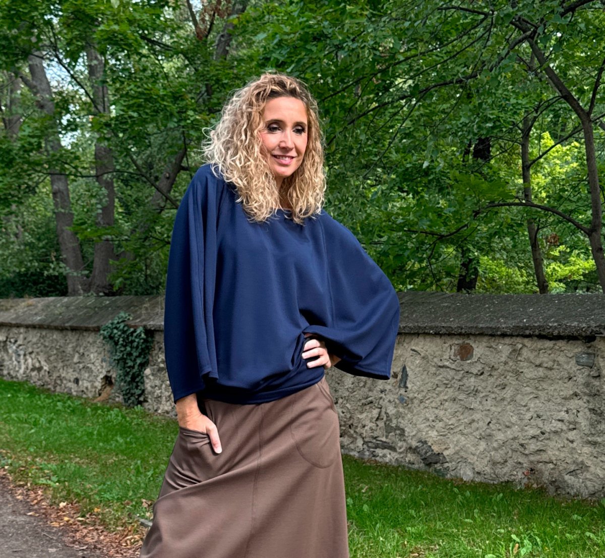 Volná tunika s netopýřími rukávy a volným výstřihem je ušitá ze směsového středně silného úpletu (měkký, pružný).