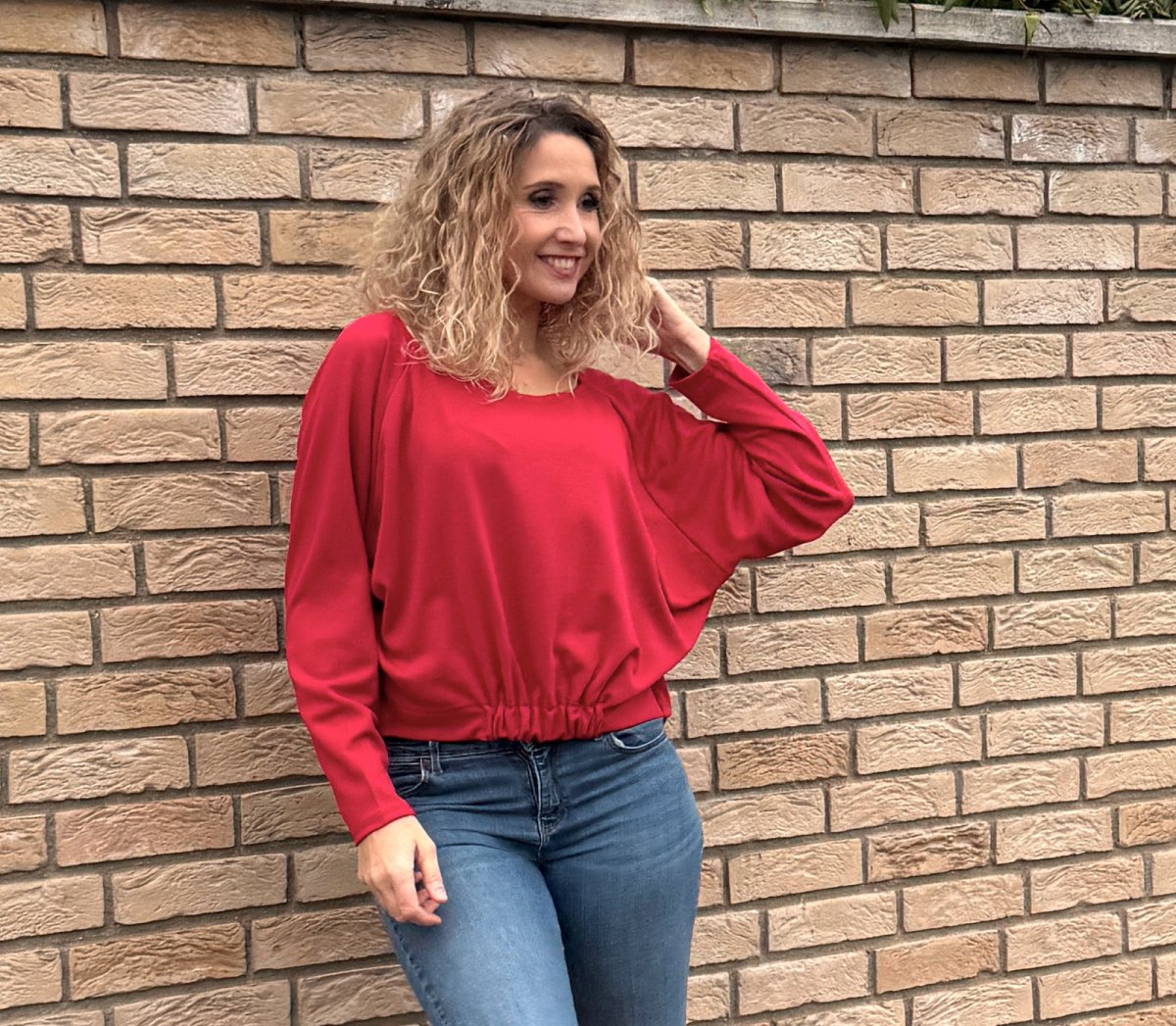 Má dlouhé rukávy se všitými nátepníky. Ne předním díle je v pase zdobený nařasením do široké gumy. Délka se mírně svažuje dozadu.