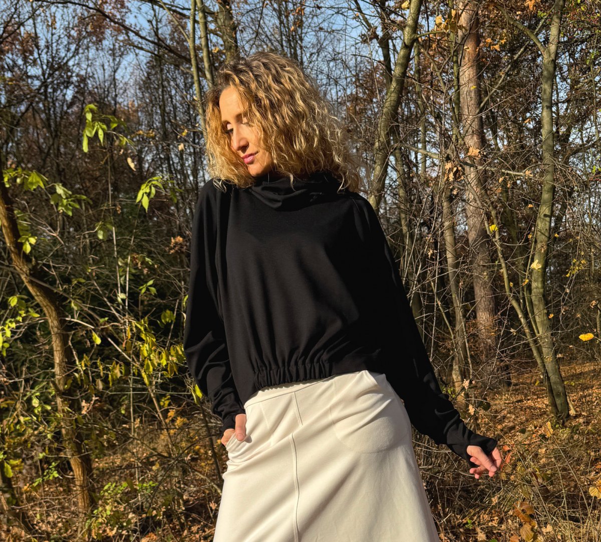 Má dlouhé rukávy se všitými nátepníky. Ne předním díle je v pase zdobený nařasením do široké gumy. Délka se mírně svažuje dozadu.
