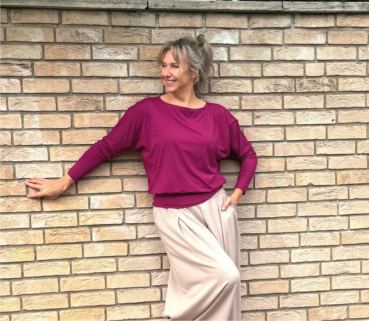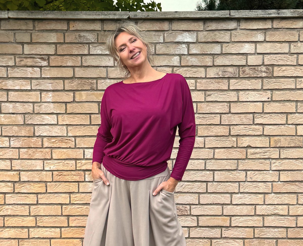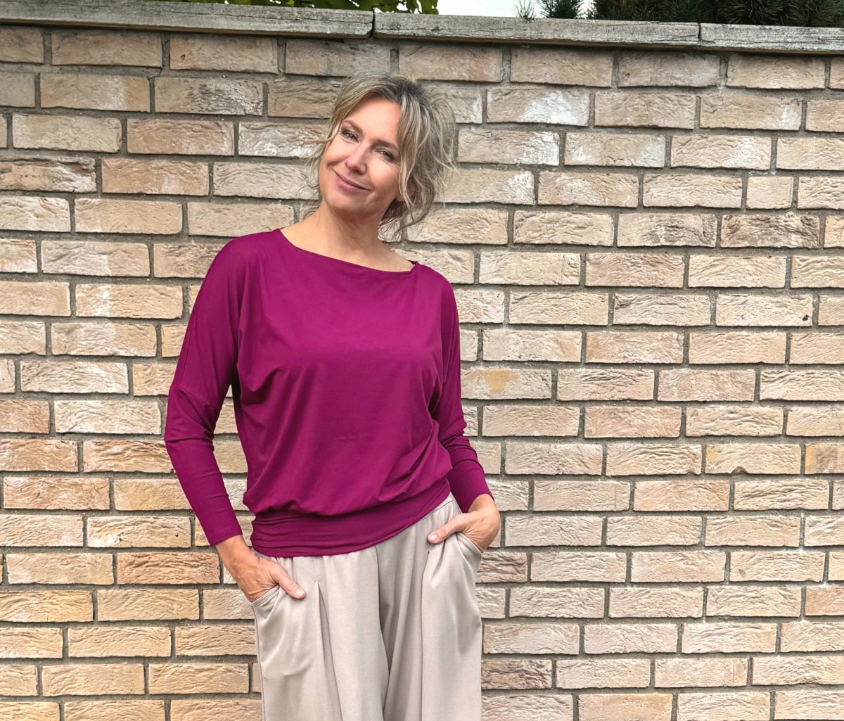 Tričko volného netopýřího střihu, které má spodní díl stažený do širokého pásku je ušité z úpletu viskóza/elastan. Rukávy jsou dlouhé.