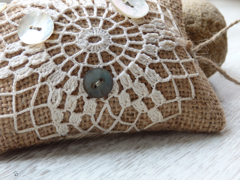 Ve voničce s vůní levandule je spojený kontrast hrubé juty a konopného provázku a něha jemné háčkované krajky z kordonetu a perleťových knoflíčků z pokladů po babičce.