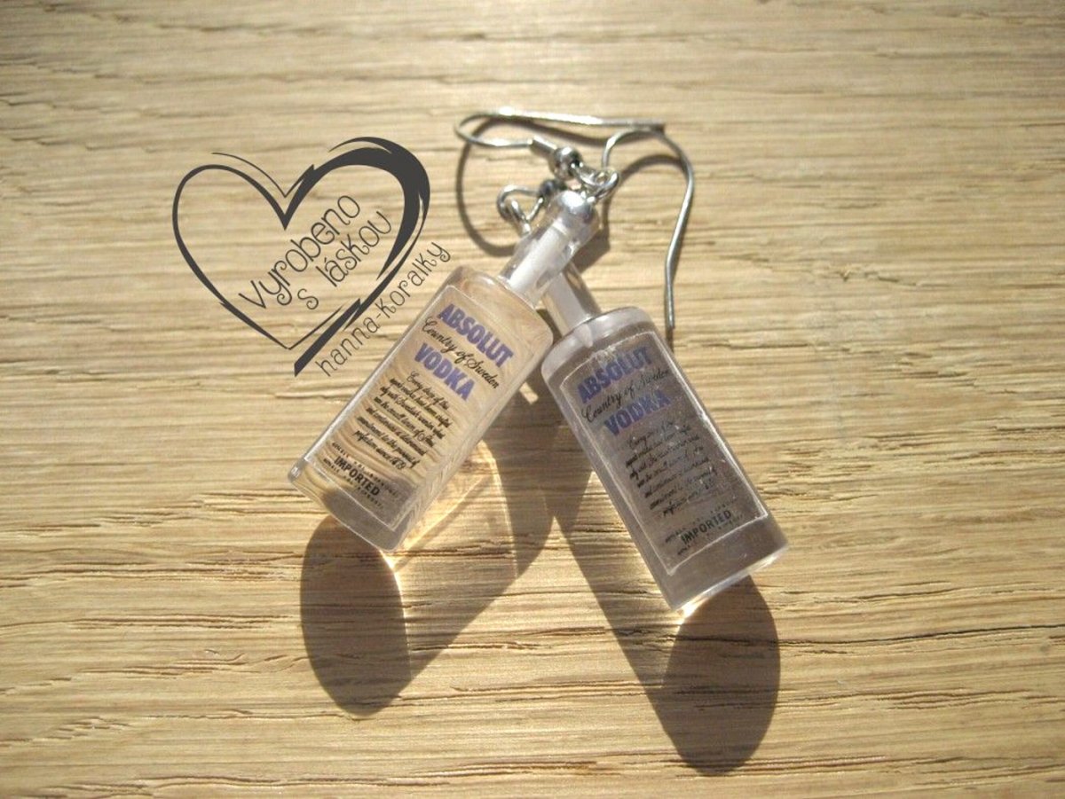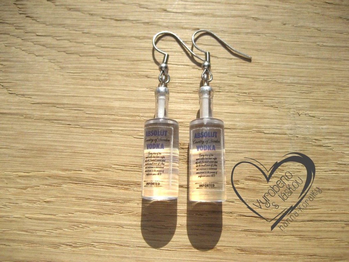 Vtipné náušnice z pryskyřice - mini láhev alkohol - vodka - výška motivu 3,3 cm + naušnicový háček z nerez oceli