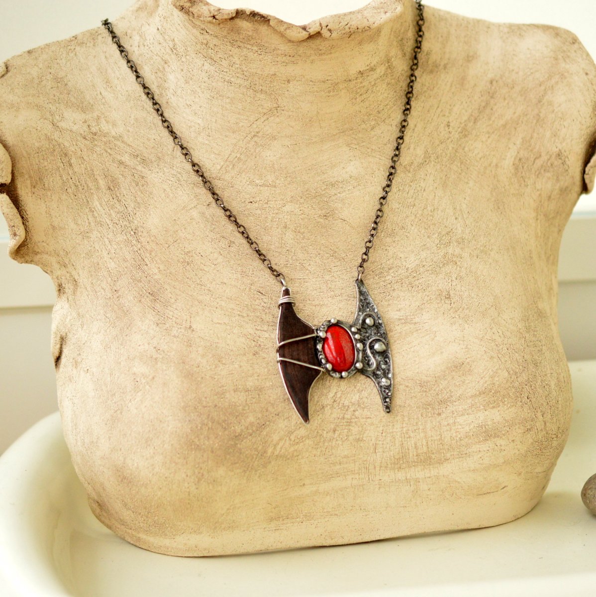 Dřevo na šperk mne potkalo pří likvidaci velkého tisu, který má poměrně tvrdé dřevo. Krásné malé polínečko ve zvláštním tvaru na mne přímo mrkalo. Poslechla jsem jeho projev a uřízla jsem s z něj tenký plátek, který jsem obrousila, dotvarovala a namořila. Aby dřevo nepřišlo přímo do styku s horkou pájkou a cínem, olemovala jsem dřevo pocínovaným drátem a pak spojila s již připravenou druhou cínovanouz půlkou. Zdoben je skeněným červeným kabošonkem o velikost 2cm x 1,5cm.