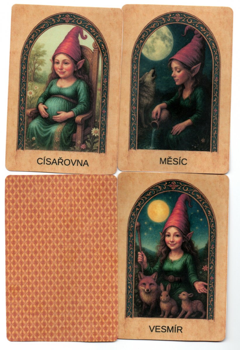 Vykládací karty VELKÁ ARKÁNA 22 ks, pohádkově laděné s trpaslíky ,velké karty vel: 8x12cm . pc tvorba na papíře 250g přelakováno proti oděru a pro pevnost karet ruční výroba