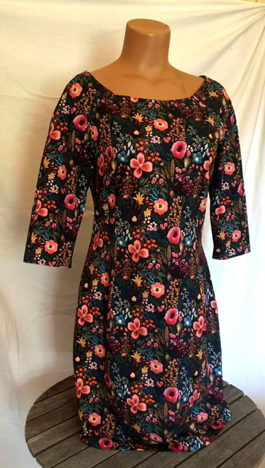 Šaty princesového střihu, vypasované, lodičkový výstřih a tíčtvrteční rukáv. Velikost M - přes prsa 95 cm, boky 100 cm, délka 92 cm. Potištěný elastický úplet, silnější.