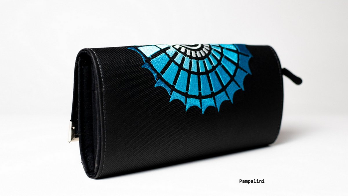 Velká peněženka ušitá z odolné kočárkoviny se strojní výšivkou. Pevně vyztužená a opatřená kovovými rohy.