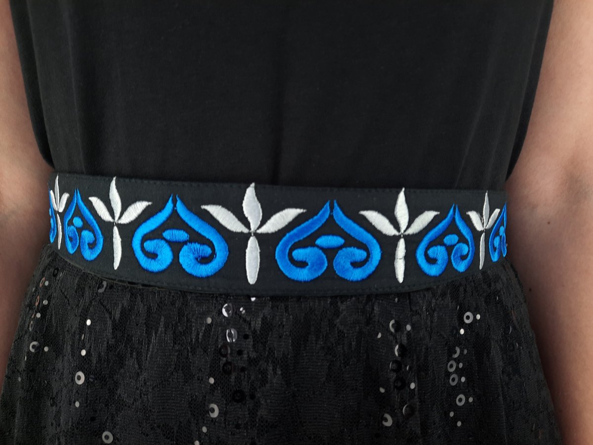Vyšívaný dámsky opasok je vhodný na popolnočný tanec k spoločenským šatám, ale aj na inú udalosť, či každodenné nosenie. Je ukončený stuhami na zaviazanie.