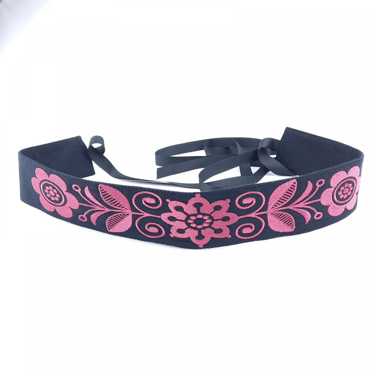 Vyšívaný dámsky opasok je vhodný na popolnočný tanec k spoločenským šatám, ale aj na inú udalosť, či každodenné nosenie. Je ukončený stuhami na zaviazanie.