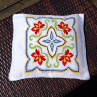 POLŠTÁŘ JE VYŠÍVANÝ NA LNĚNÉ KANAVĚ, BAVLNKAMI, NENÍ SEŠÍVANÝ ALE SHÁČKOVANÝ A PO CELÉM OBVODU OBHÁČKOVANÝ BAVLNĚNOU PERLOVKOU. NA SPODNÍ STRANĚ POLŠTÁŘE JE RUČNĚ VŠITÝ SUCHÝ ZIP.