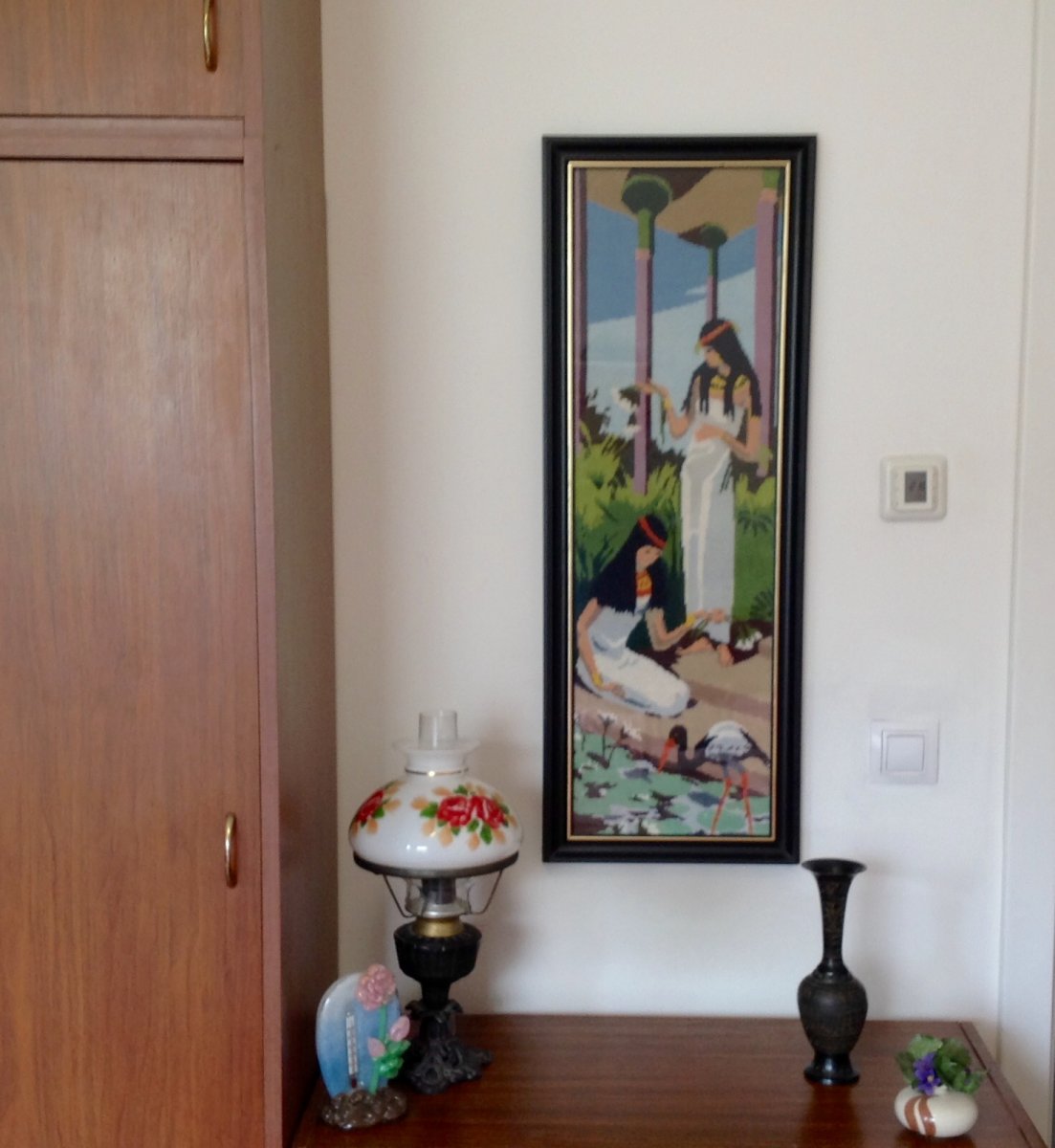 OBRAZY NEJSOU VYŠITÉ NA PŘEDTISKNUTÉM PLÁTNĚ ALE JSOU VYŠITÉ PODLE PŘEDLOH ZE ZAHRANIČNÍH ČASOPISŮ A TO PODLE ZNAČEK. NĚKTERÉ OBRAZY JSOU VYŠITY AŽ ZE ČTYŘICETI RŮZNÝCH ODSTÍNŮ COŽ JE VELMI NÁROČNÉ, KDYŽ SE STANE ŽE SE ZMÝLÍ ZNAČKU JE TŘEBA VYPÁRAT NĚKDY I VĚTŠÍ PLOCHY.
