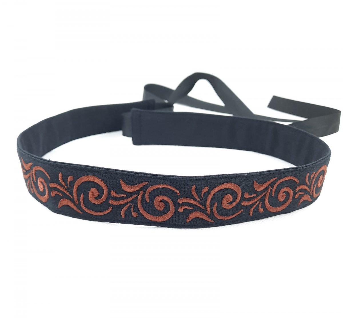 Opasok je strojovo vyšívaný. Základom je čierny bavlnený podklad na ktorom sú vyšité jemné ornamenty. Opasok je z bavlnenej látky a vo vnútri je kvalitne vystužený, aby dobre držal tvar. Šírka opasku je 3,5 cm a je rovnaká v celej jeho dľžke. V zadu sa viaže pomocou stuhy v čiernej farbe. Údržba - najlepšie prať pri 30 stupňoch C, jemne vyžmýkať a nechať voľne osušiť. Prežehliť z rubovej strany, líc cez bavlnené plátno.
