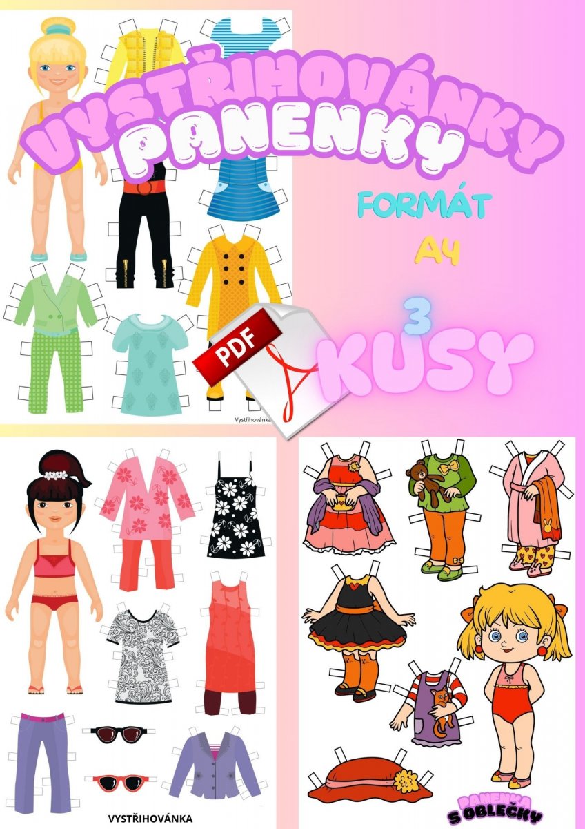 ✅ 3 Panenky k vystřižení – ilustrované postavičky s pevnými záložkami na oblečení