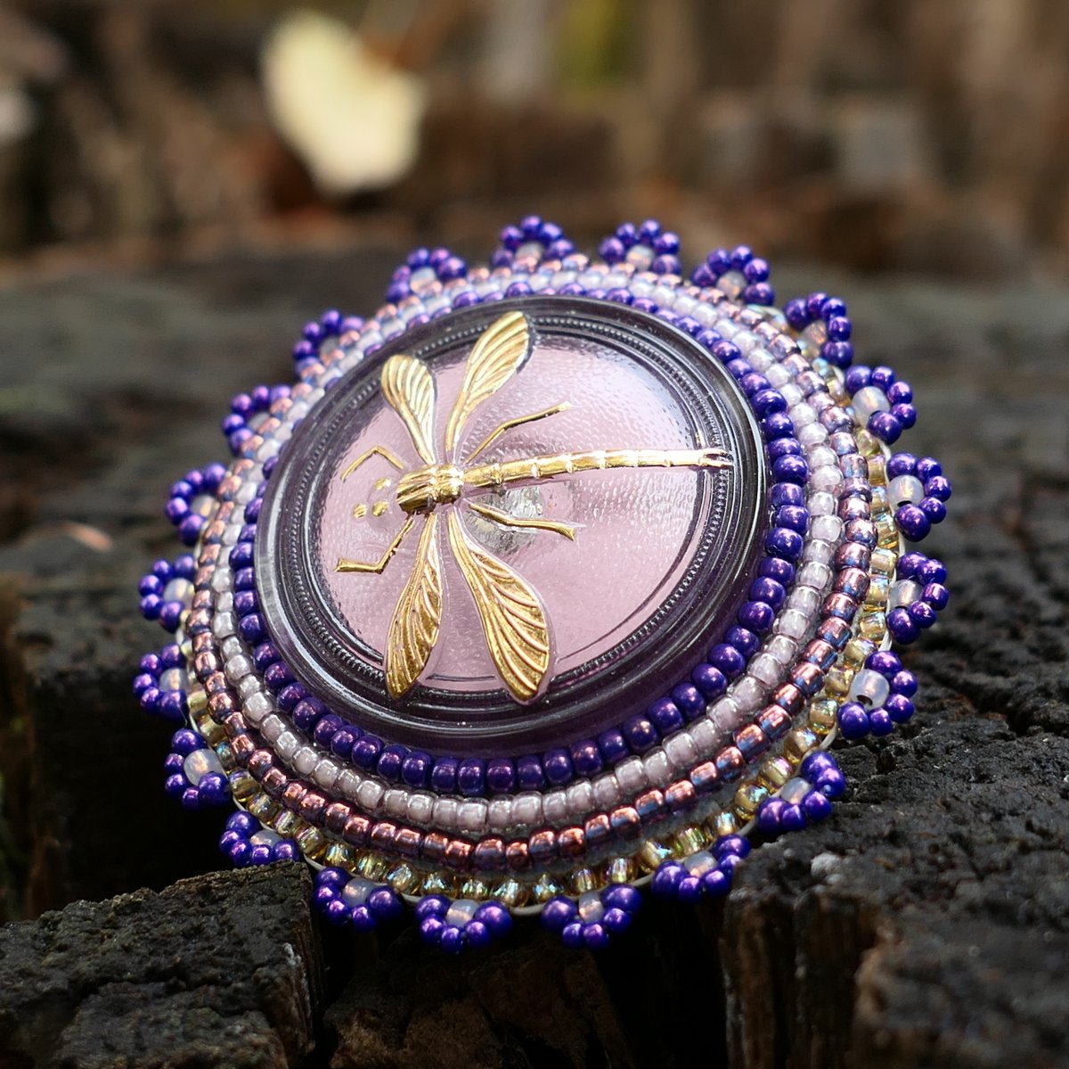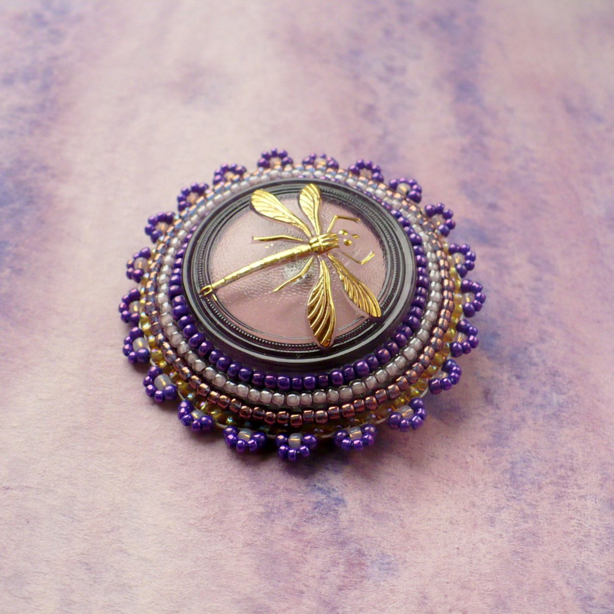 Brož vyrobená technikou korálkové vyšívky - každý korálek přišit zvlášť. Uprostřed je skleněný, ručně malovaný knoflík vinovofialové a starorůžové barvy se zlacenou vážkou. Podšito šedou alcantarou, brožový můstek d. 3 cm.