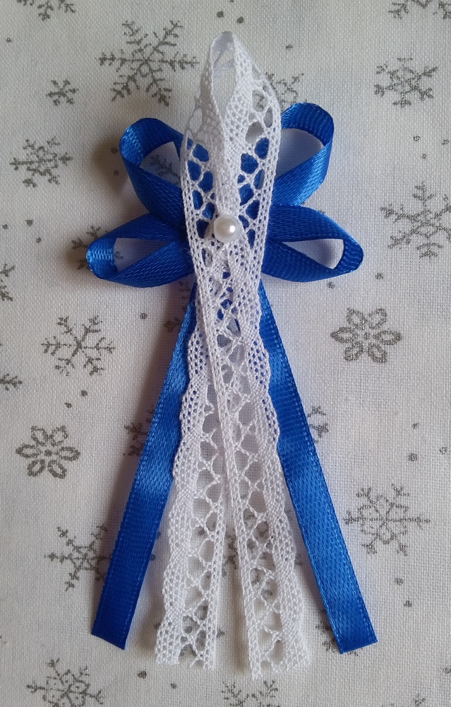 Velký modrý vývazek s bílou krajkou a bílou perličkou pro svědky a rodiče. Rozměry horní části jsou 5 cm šířka, 3 cm výška, délka ocasu je 8 cm.