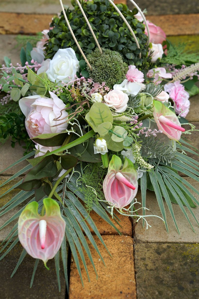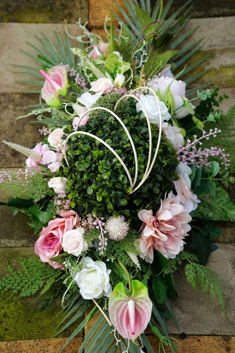 Smuteční dekorace k položení na hrob, rozměr 80x40x22cm. Dekorace je umístěna na kamenné podložce, aby odolala větru.