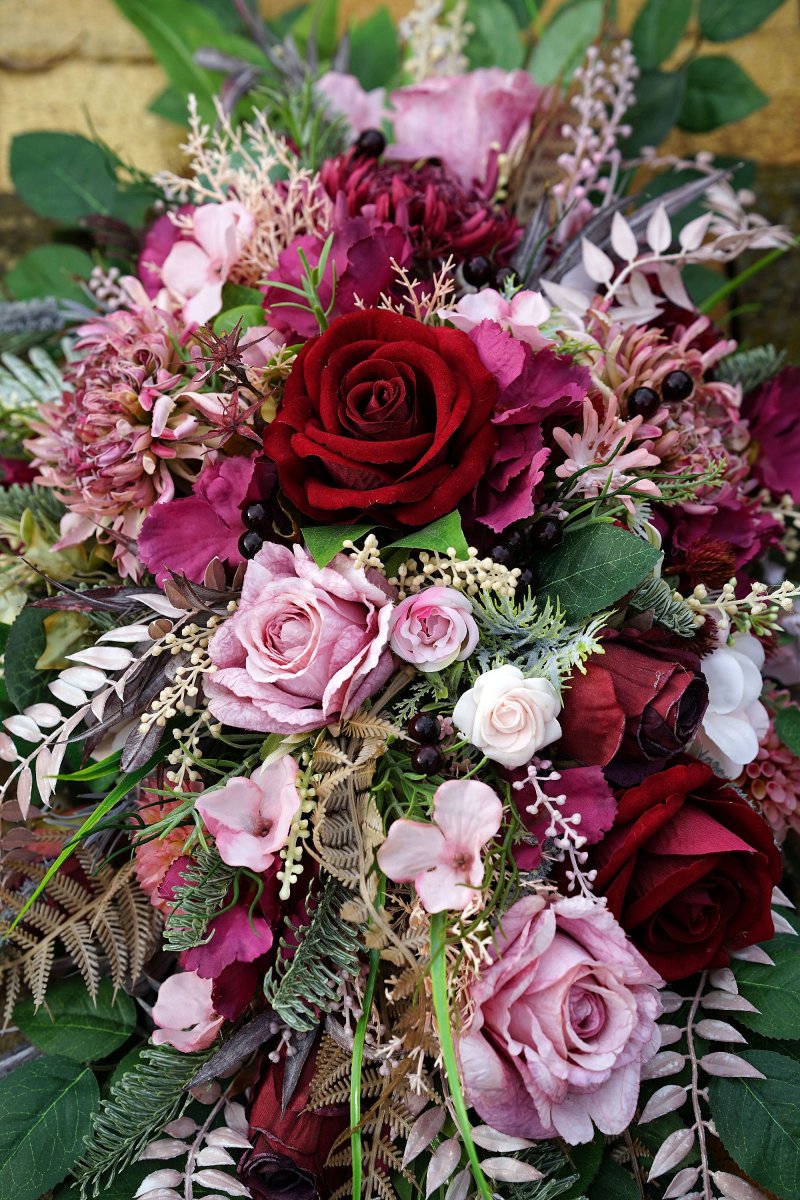 Velká vzpomínková dekorace v bordo a růžové barvě. Rozměr 80x40x20cm. Je připevněna na kamenné podložce, aby odolala větru.